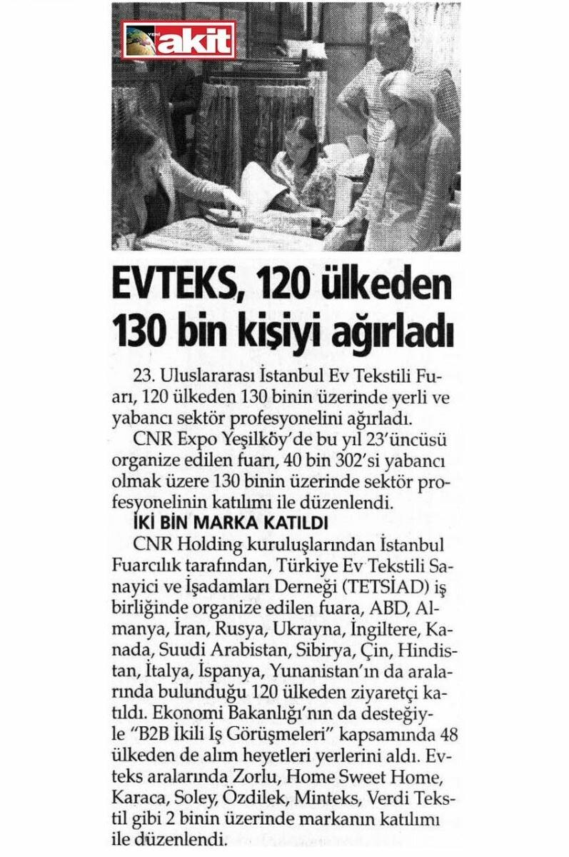 Ev tekstili sektöründeki son gelişmelerin sergilendiği, trend ve modaya yön veren ürünlerin ziyaretçilerin beğenisine sunulduğu Uluslararası İstanbul Ev Tekstili Fuarı (EVTEKS) sektör profesyonelleri tarafından ilgiyle takip edildi. CNR EXPO Yeşilköy’de bu yıl 23’üncüsü organize edilen fuarı, 40 bin 302’si yabancı olmak üzere 130 binin üzerinde sektör profesyonelinin katılımı ile düzenlendi. CNR Holding kuruluşlarından İstanbul Fuarcılık tarafından, Türkiye Ev Tekstili Sanayici ve İşadamları Derneği (TETSİAD) iş birliğinde organize edilen fuara, ABD, Almanya, İran, Rusya, Ukrayna, İngiltere, Kanada, Suudi Arabistan, Sibirya, Çin, Hindistan, İtalya, İspanya, Yunanistan’ın da aralarında bulunduğu 120 ülkeden ziyaretçi katıldı. Ekonomi Bakanlığı'nın da desteğiyle "B2B İkili İş Görüşmeleri" kapsamında 48 ülkeden de alım heyetleri fuardaki yerlerini aldı. Türkiye’de yıldızı parlayan ev tekstil sektörünün en büyük platformu olan EVTEKS aralarında Zorlu, Home Sweet Home, Karaca, Soley, Özdilek, Minteks, Verdi Tekstil gibi 2 binin üzerinde markanın katılımı ile düzenlendi. 160 bin metrekare alanda gerçekleştirilen fuarda, yazın serin tutan pikelerden yazın serin, kışın sıcak tutan yastıklara ve anti bakteriyel nevresimlere kadar sektörde çığır açacak pek çok inoavatif ev tekstili ürünleri sergilendi.